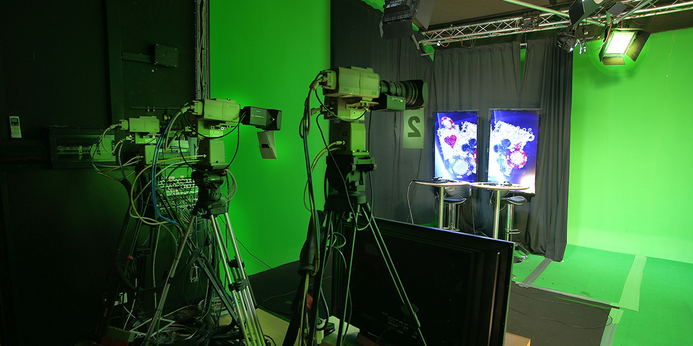 Zona Sinfín color Chroma Verde. Cámaras robotizadas e incrustación en tiempo real. Perfecto para pequeñas programas de televisión en directo, autopromos con incrustación de la imagen en tiempo real. Muy versatil con techos instalados con parrillas trush para colgar todo tipo de decorados e iluminación, preparado todo con instalación DMX. Insonorizado y acondicionado acústicamente para poder realizar cualquier tipo de grabación con alta calidad.